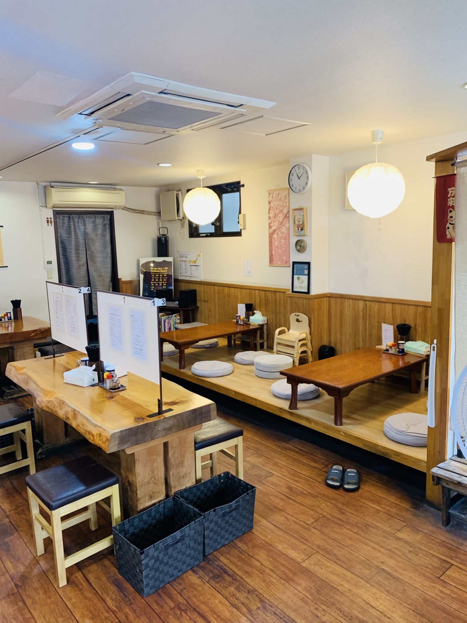 木の温もりを感じる店内には、カウンター席から座敷まで用意されており、ひとりでも家族連れでも利用しやすい雰囲気となっています。