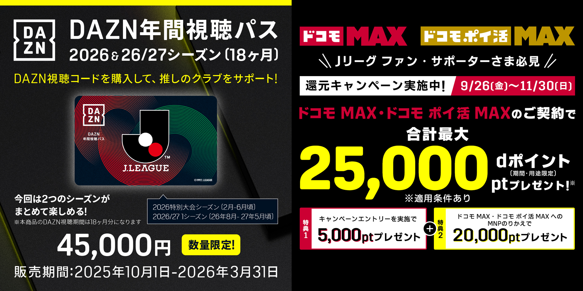 10月1日(水)より、「DAZN年間視聴パス2026 & 2026/27シーズン(18ヶ月)」の販売を開始します。