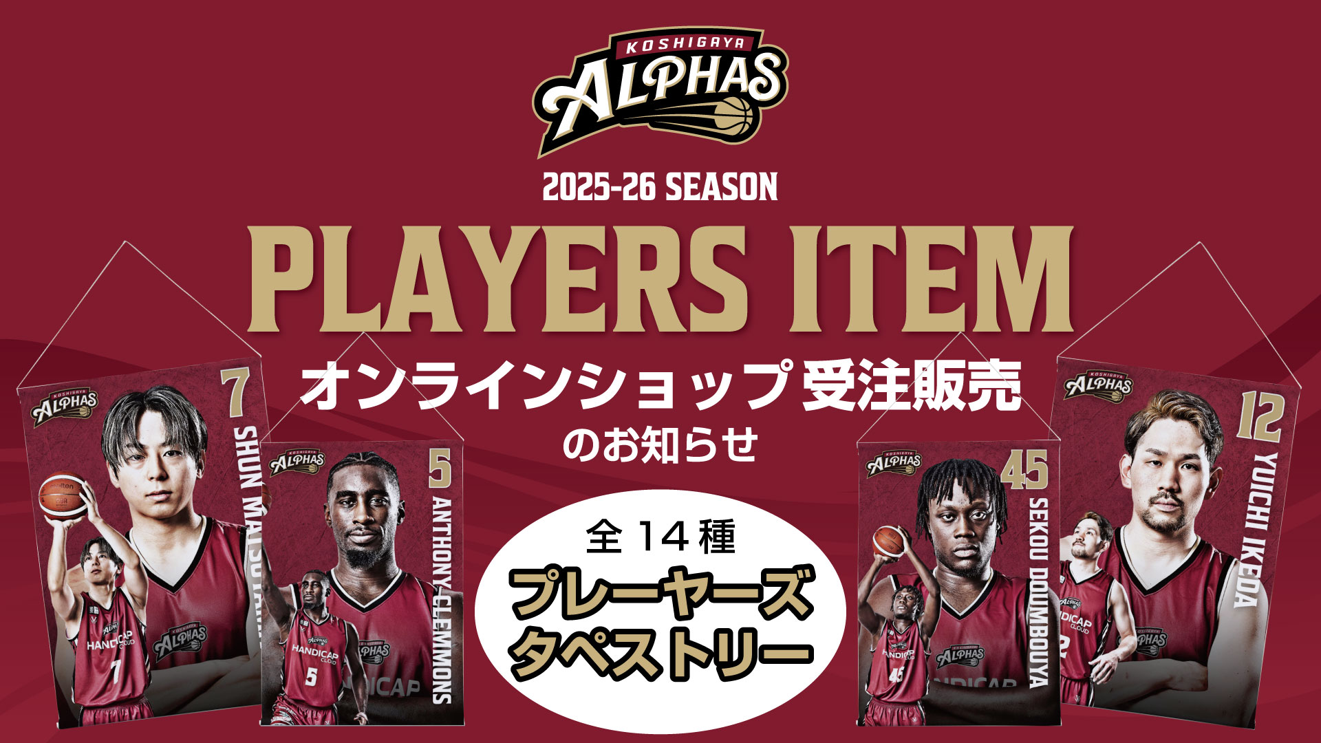 越谷アルファーズ"オフィシャルグッズオンラインショップ"では、2025-26シーズンの越谷アルファーズ選手の背番号とネームをプリントしたユニフォーム型の【プレーヤーズタペストリー】の受注販売を実施いたします。