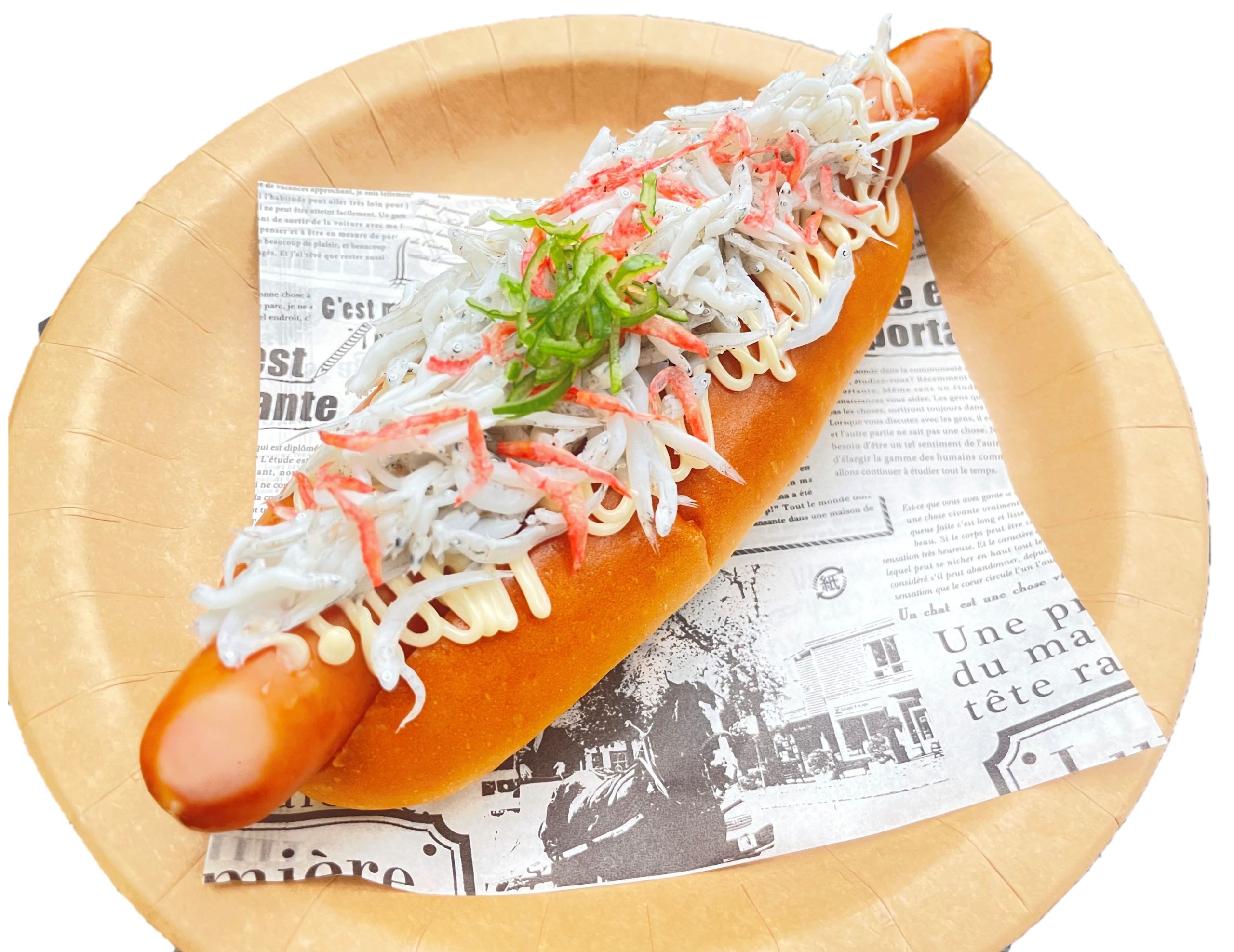 紹介文:ジューシーなロングウインナーに、ふんわり食感のしらすと桜えびをたっぷりトッピング。