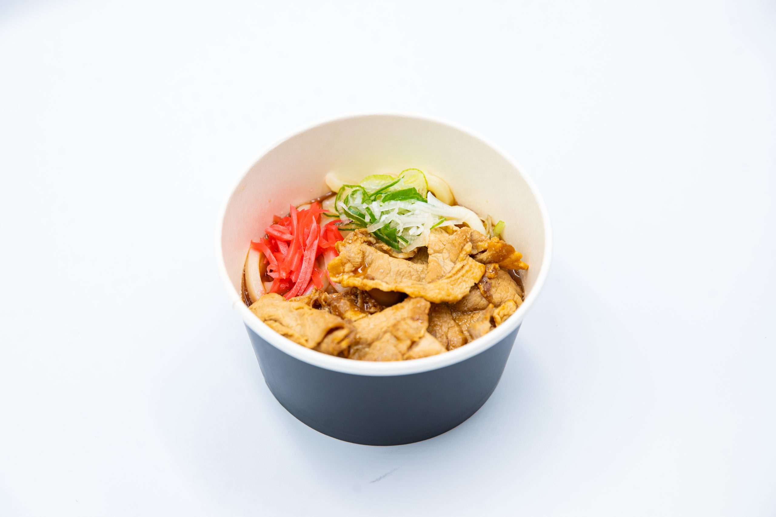 京風の白だしに和風に味付けしたお肉、埼玉県産深谷ネギ、紅ショウガをトッピングしました。マリウスが気に入った、【七味】もお好みでかけてお召し上がりください。