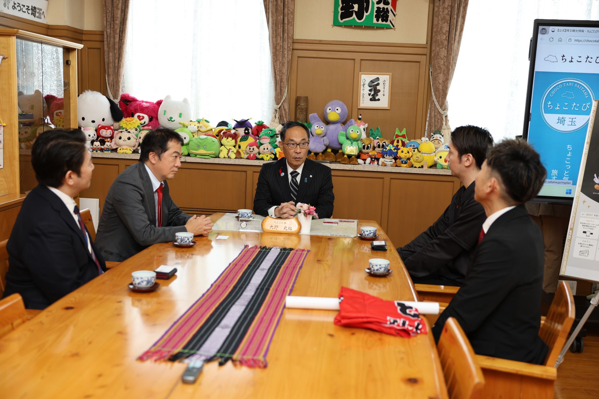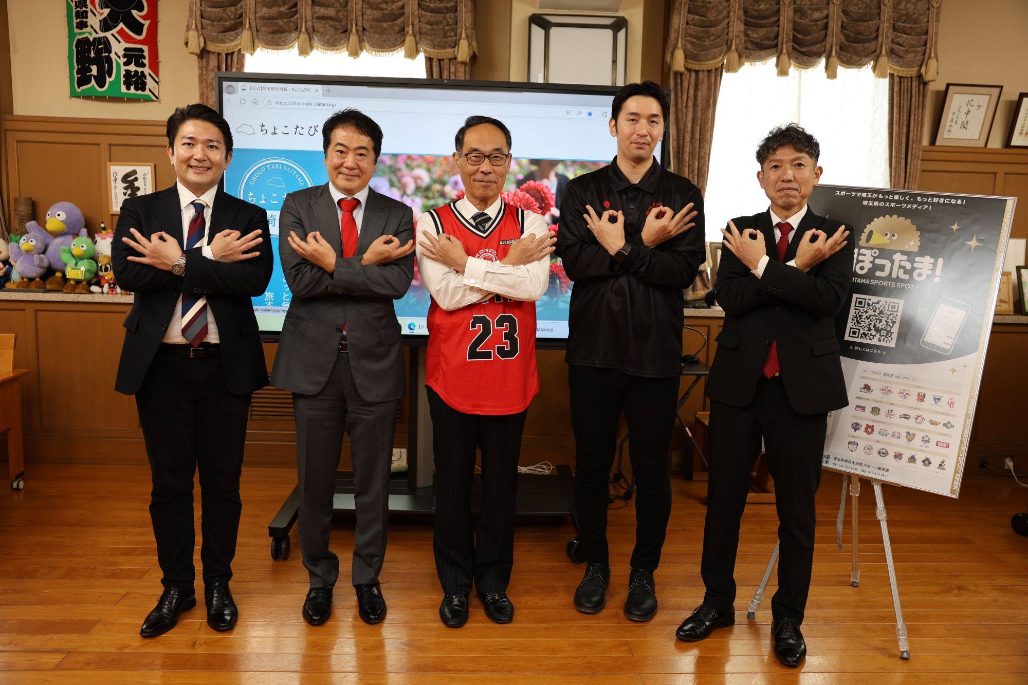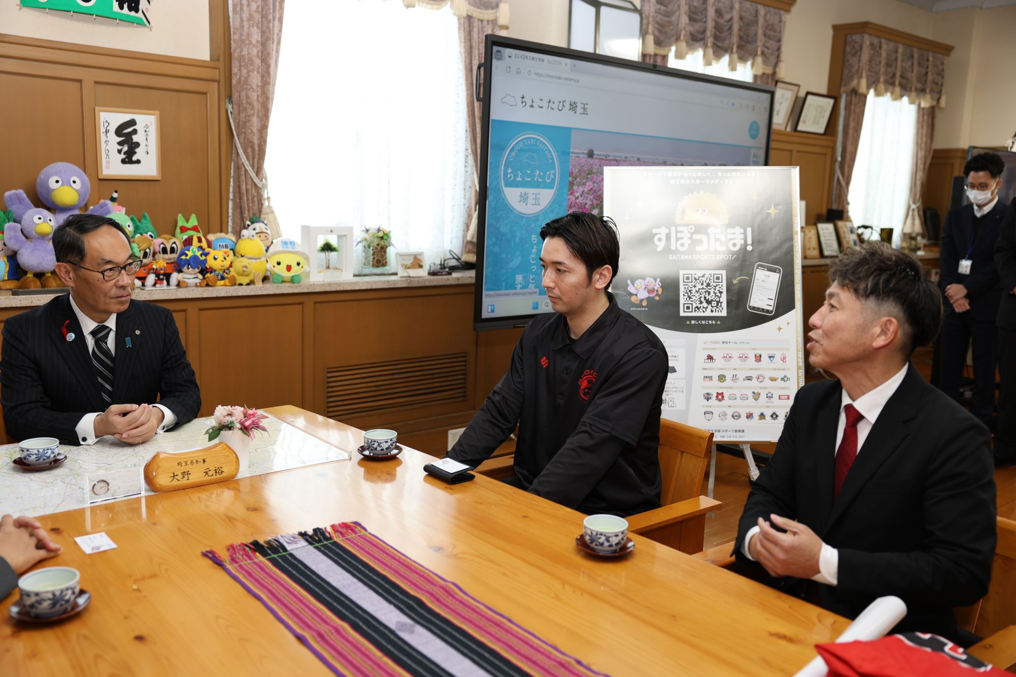 B3リーグ2025-26シーズンへの決意を報告するため、ディップ株式会社の志立COO、新居常務執行役員、さいたまブロンコス20の小竹社長、川邉亮平選手(キャプテン)が埼玉県庁で大野知事を表敬訪問し、今シーズンへの意気込みを語った。