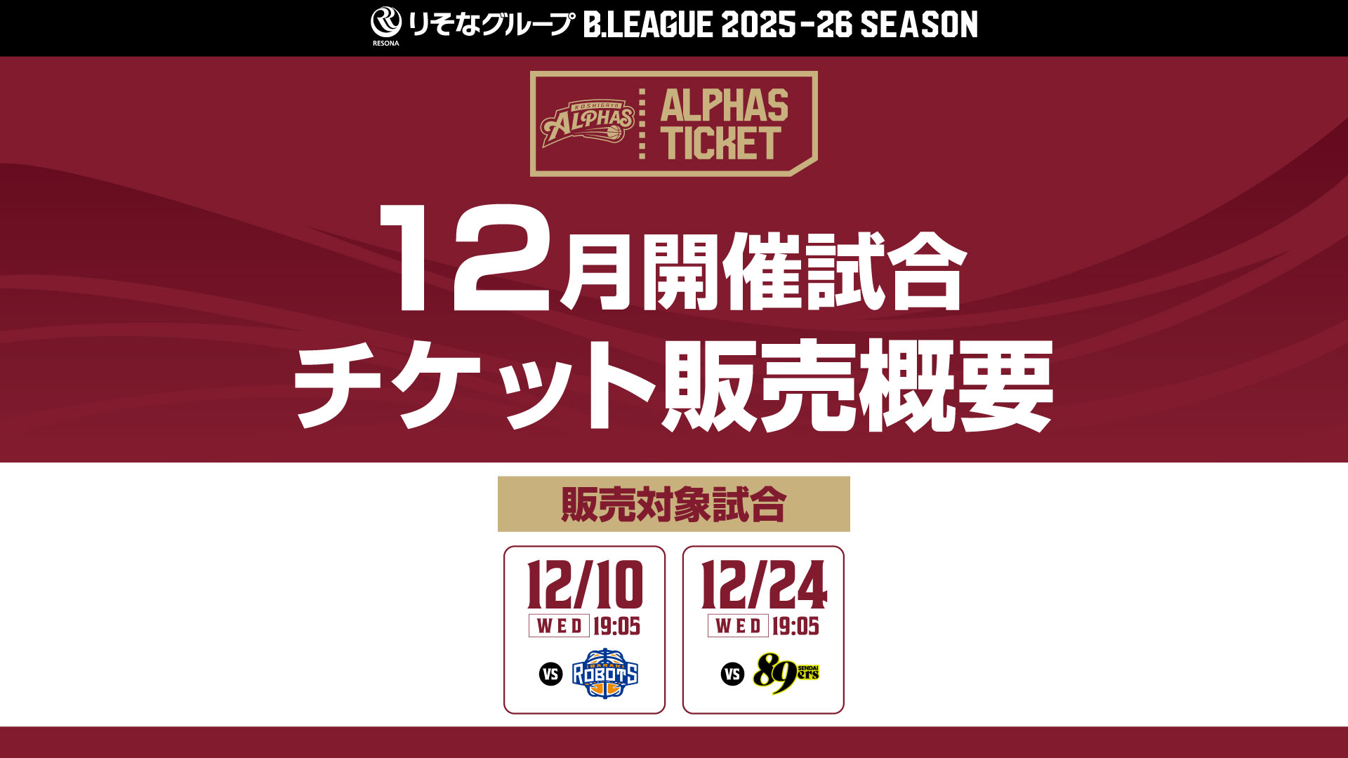 りそなグループB.LEAGUE 2025-26 SEASONの越谷アルファーズ"12月開催試合チケット販売概要"が決定しましたのでお知らせいたします。