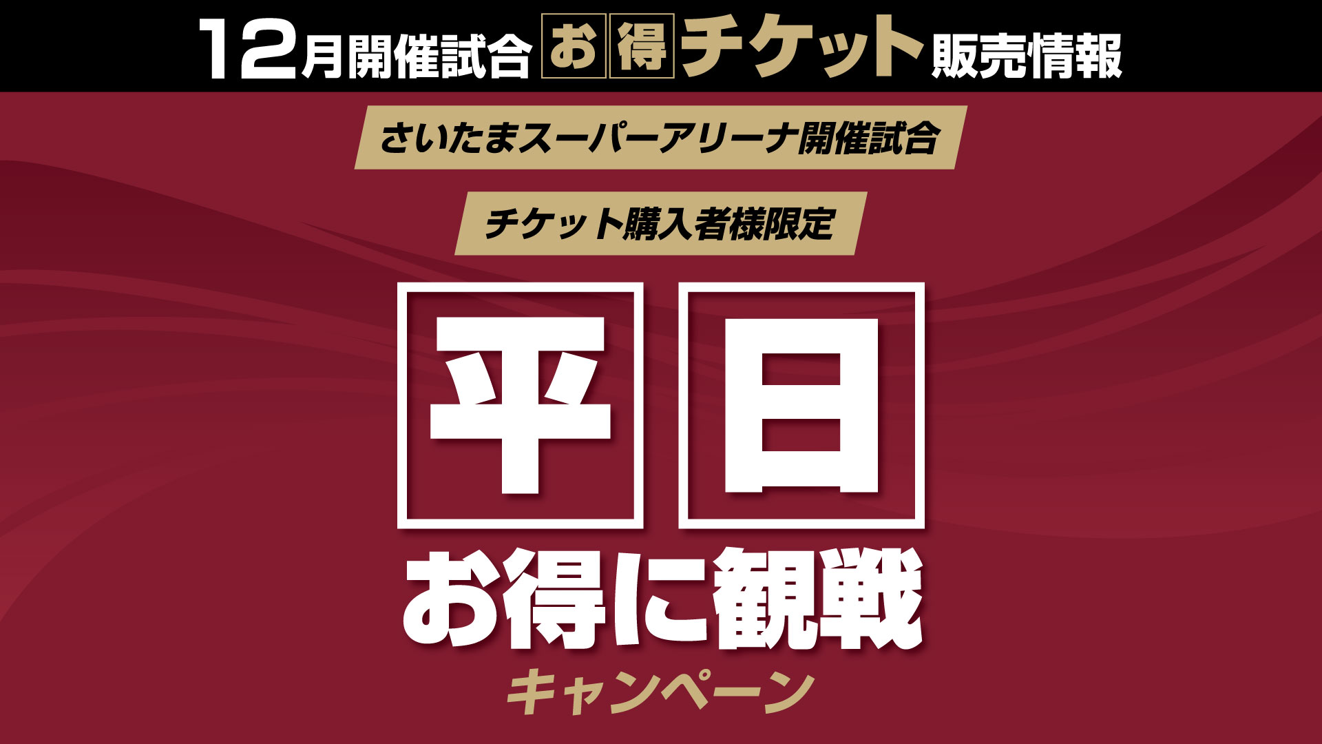 12月に開催する4試合をより多くの皆さまにお楽しみいただきたく、さいたまスーパーアリーナ開催試合のチケット購入者様限定で【平日お得に観戦キャンペーン】を実施させていただきます!!