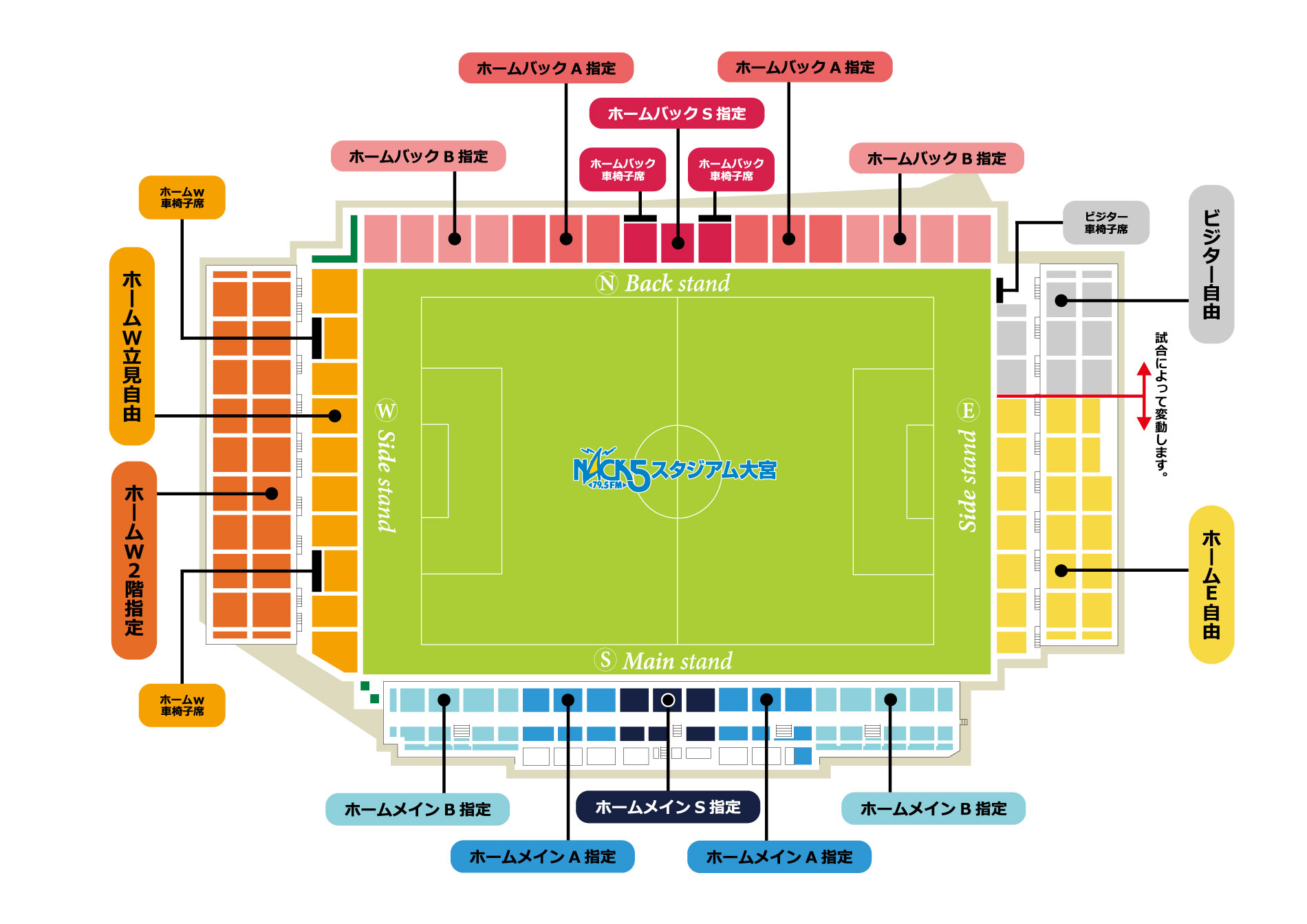 [2025年まで] ホームバックSA自由 → [2026年以降] ホームバックB指定[2025年まで] ホームサポーターゾーン2階(Wエリア) → [2026年以降] ホームW2階指定