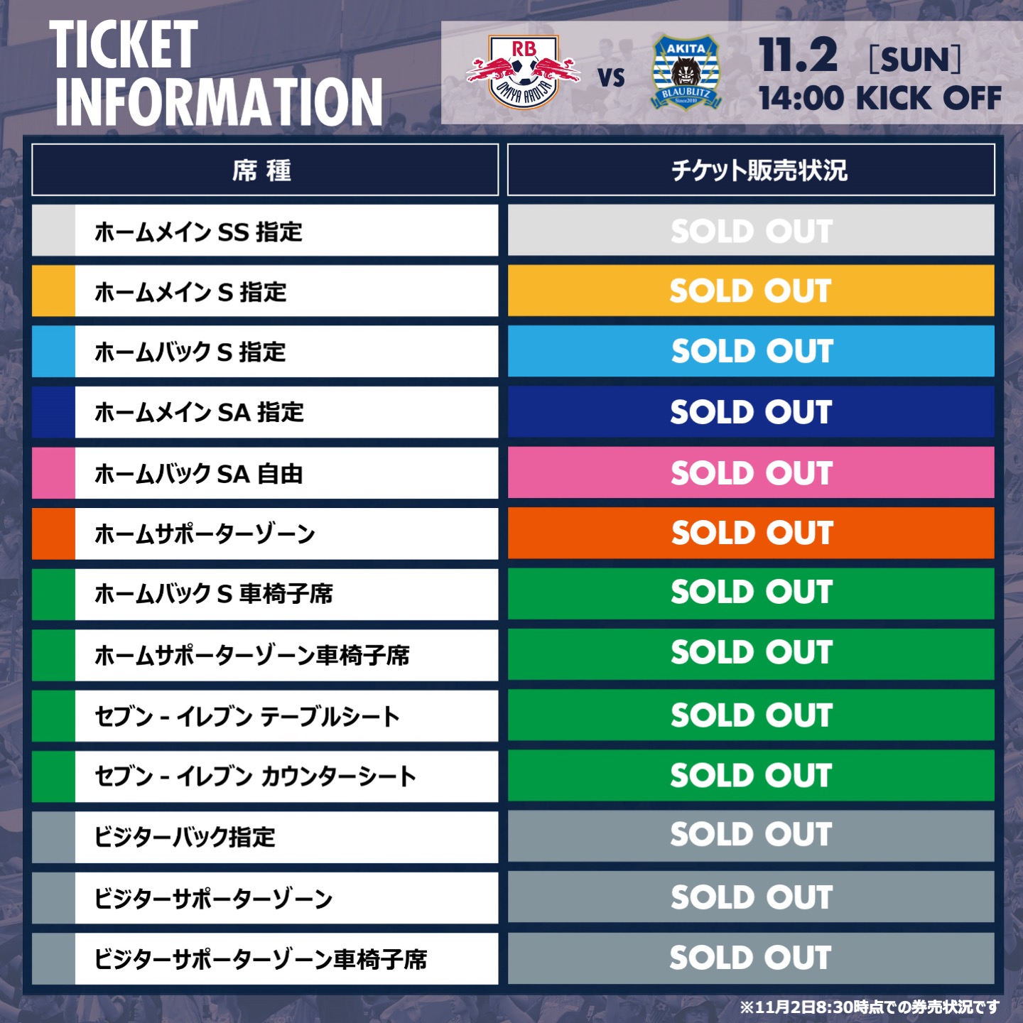 販売予定枚数終了に伴い、クラブショップや当日券売場でも11/2・秋田戦のチケットの取り扱いはありません。