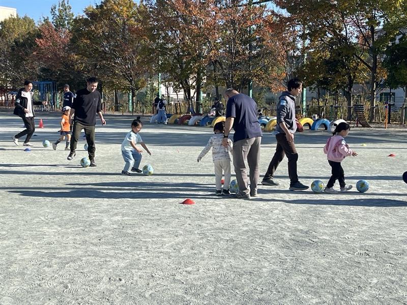 RB大宮アルディージャサッカースクールコーチ指導の下、午前は少年少女を対象とした年長〜小学6年生の27名の子どもたちが参加しました。学年ごとにグループに分かれ、パスやドリブルの練習やミニゲームを行いました。午後は年中〜小学3年生の親子サッカーを実施し、24組の親子がコミュニケーションを取りながら、秋晴れのスポーツ日和の中、一生懸命ボールを追いかけサッカー教室を楽しみました。