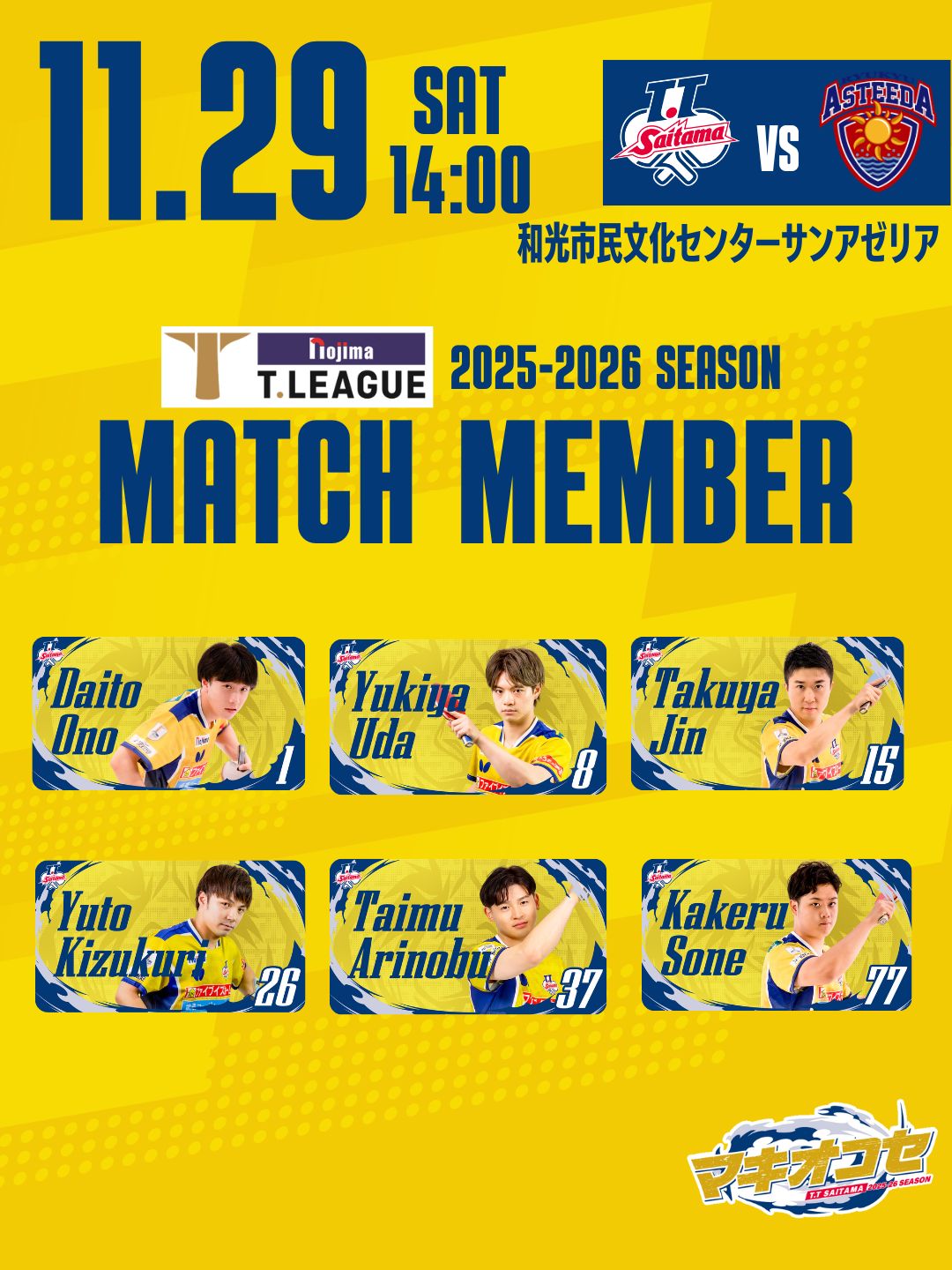 2025.11.26 T.T彩たま 11月29日和光市民文化センターサンアゼリア 琉球アスティーダ戦 ベンチ入りメンバー発表 #T.T彩たま オリジナルサイトで読む 【T.T彩たま ベンチ入りメンバー】 #1 小野 泰和 #8 宇田 幸矢 #15 神 巧也 #26 木造 勇人 #37 有延 大夢 #77 曽根 翔 ※状況により、ベンチ登録選手がメンバーから外れる場合もございます。予めご了承ください。 【琉球アスティーダ ベンチ入りメンバー】 #1 吉村 真晴 #9 鈴木 颯 #19 坂井 雄飛 #22 大島 祐哉 #87 上江洲 光志 ホームマッチ情報はこちら▼ 記事一覧に戻る