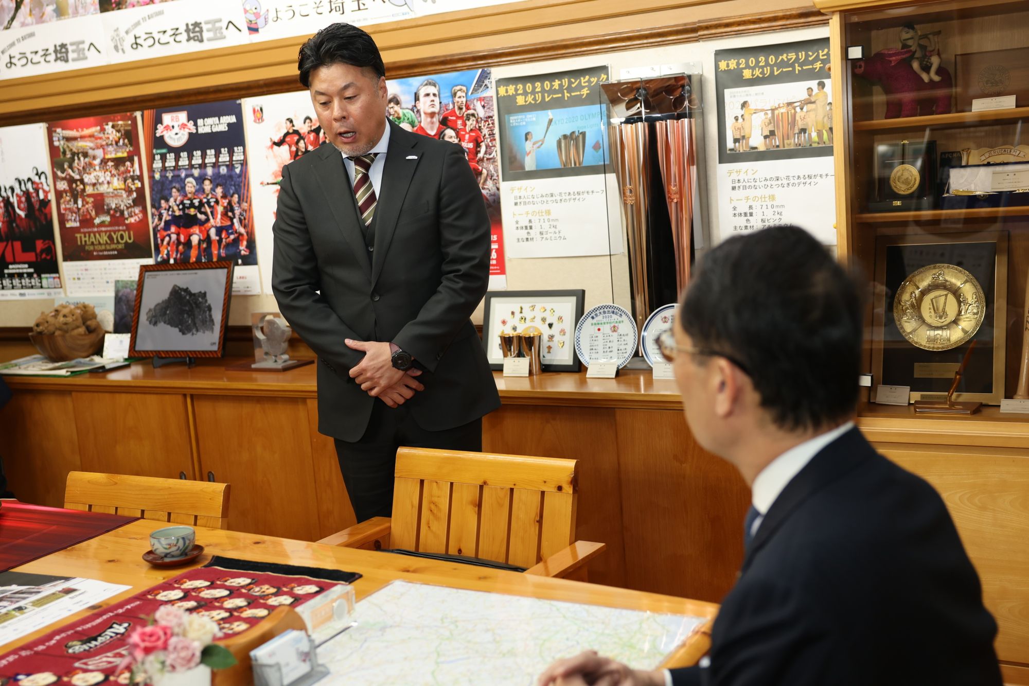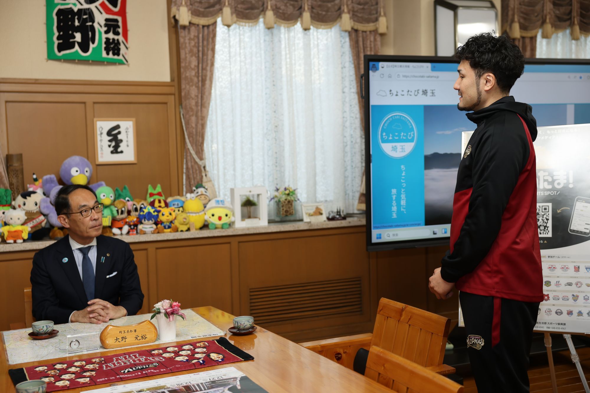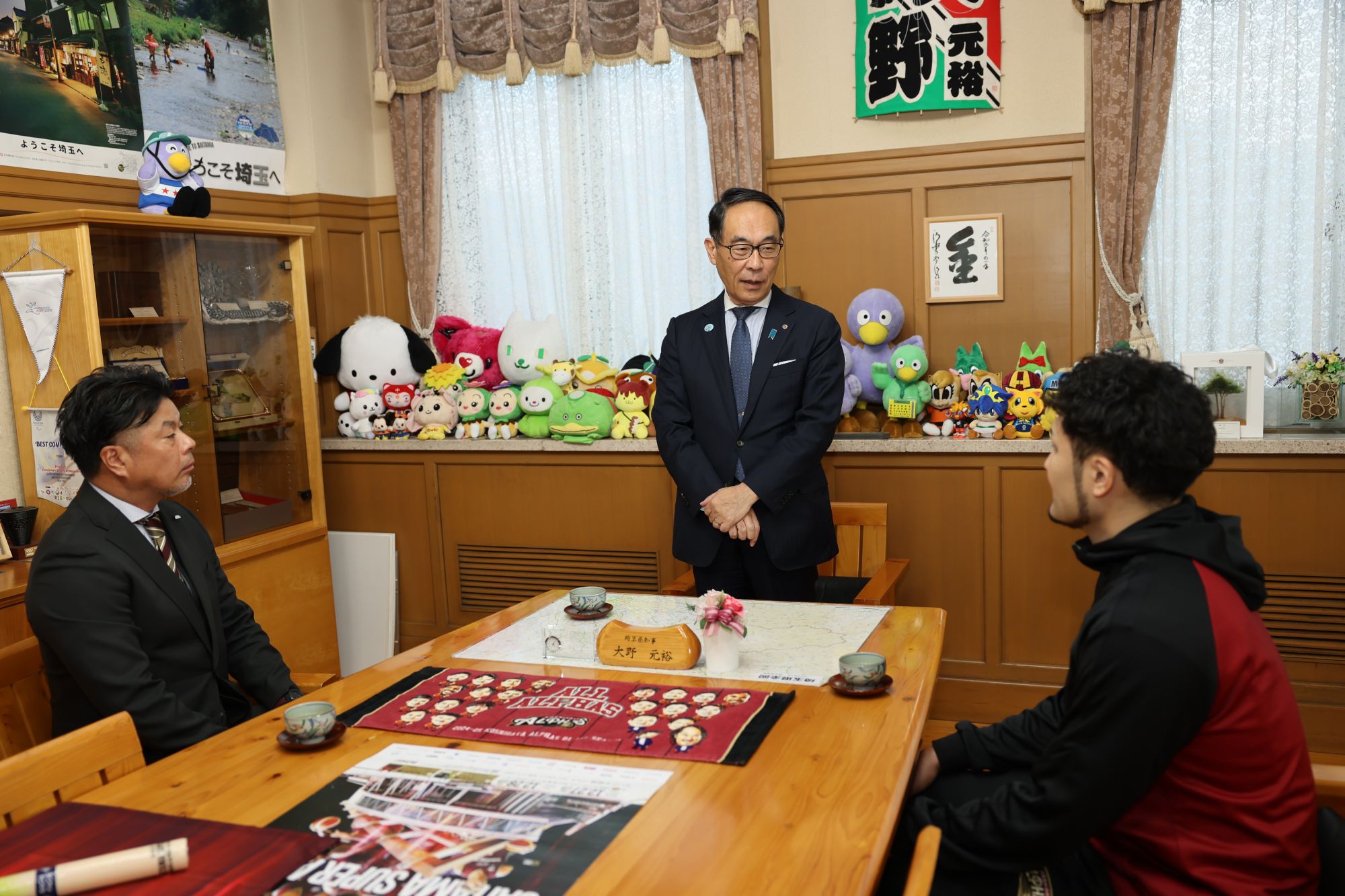 12月1日(月)に株式会社アルファーズ上原社長、越谷アルファーズ喜多川キャプテンが埼玉県庁で大野知事を表敬訪問し、さいたまスーパーアリーナ開催試合への意気込みを語った。