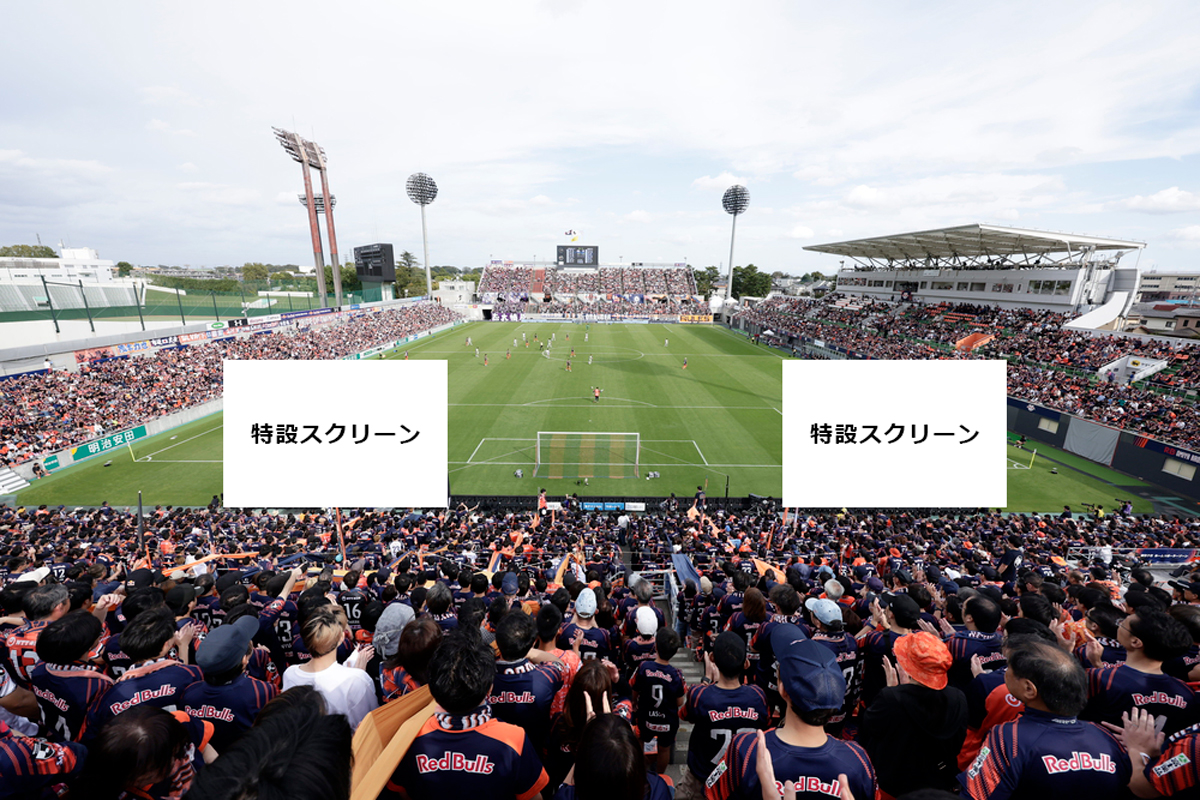 Wエリアスタンドに向けて特設スクリーンを2台設置して、試合を放映します。