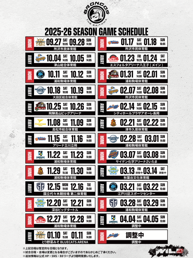 この度さいたまブロンコスでは調整中となっておりました試合時間・日程についての確定がございましたので、ご報告いたします。