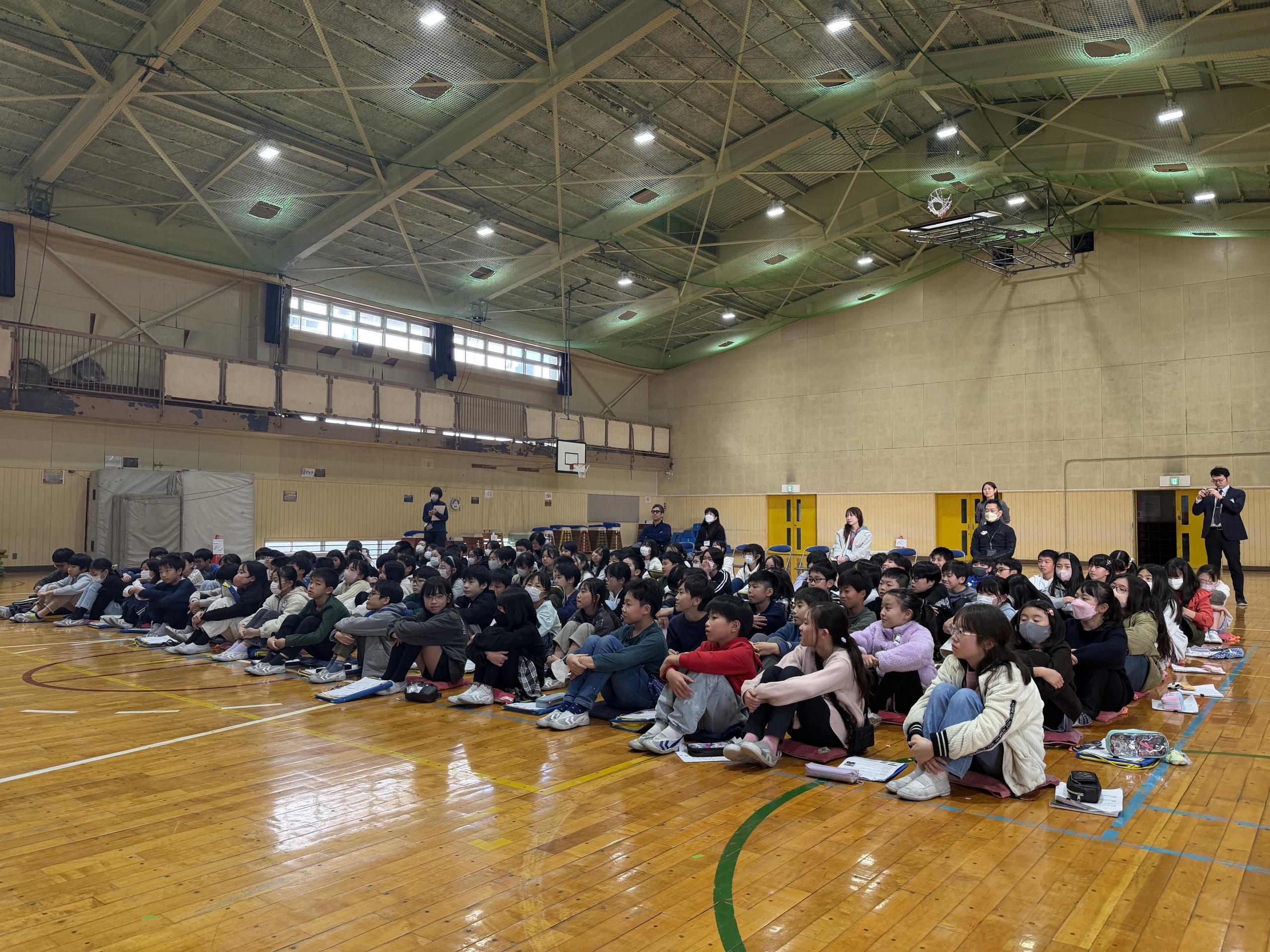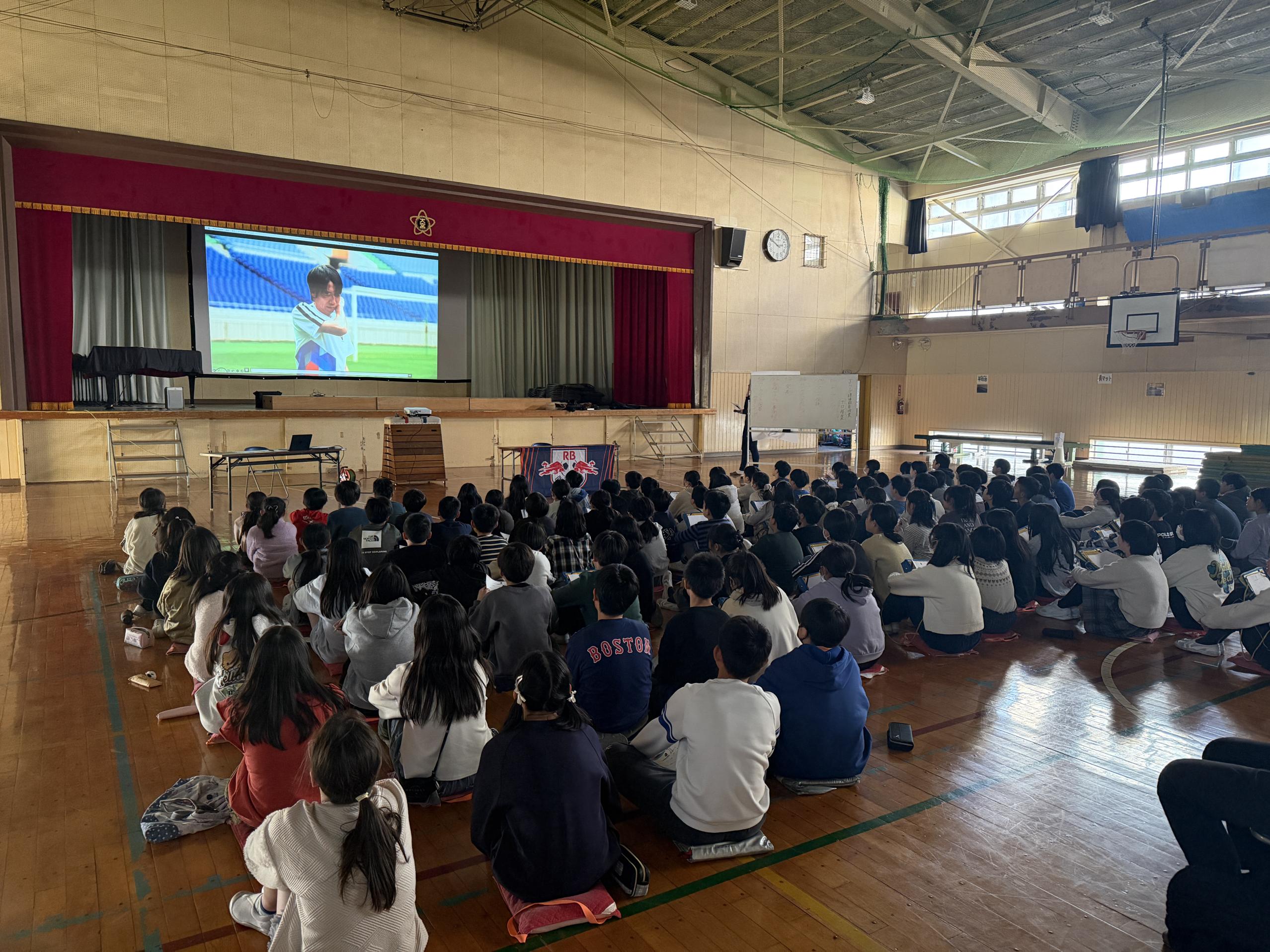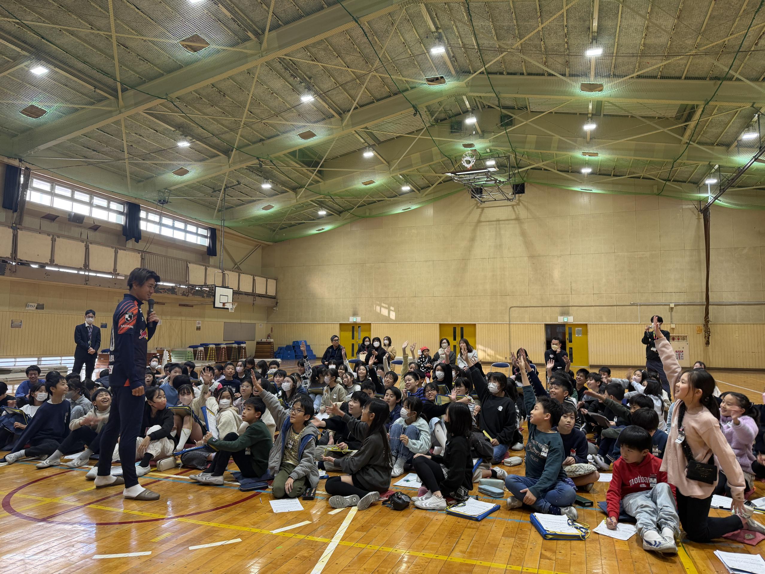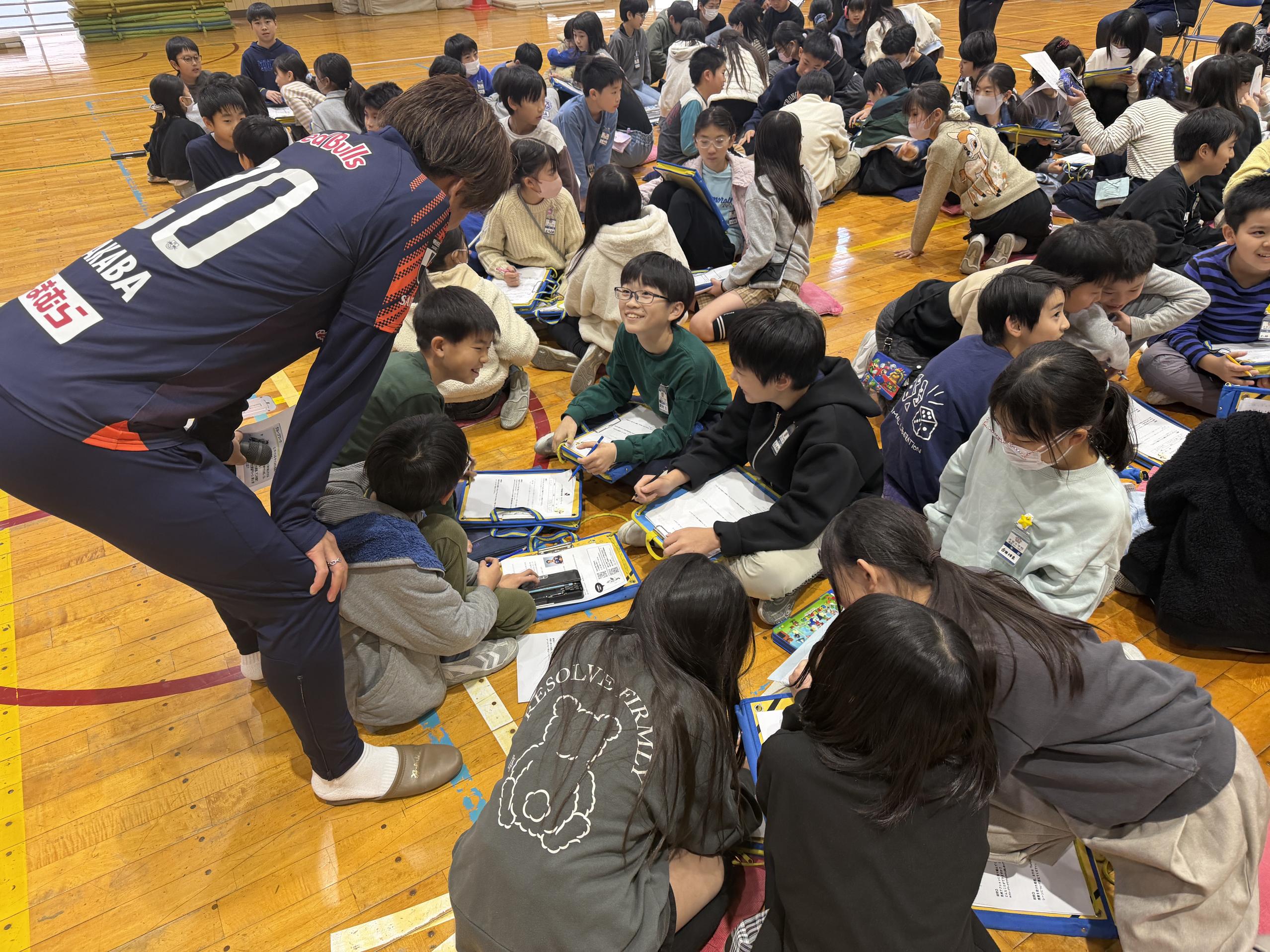 当日は、Jリーグより認定された「気候アクションアンバサダー」の下口稚葉 選手が環境教育授業を行い、5年生107名の子どもたちと一緒に、地球温暖化など直面している環境問題などについて話しました。気候変動問題についてのアニメ「Future Kid Takara」を観たあと各グループに分かれ、取り組みたい気候アクションや自分たちにできることなどを話し合い、ディスカッションを行いました。発表の際にも積極的に手を挙げ、みんな真剣に取り組んでくれ、自分たちの未来を一緒に考えるとても良い時間となりました。