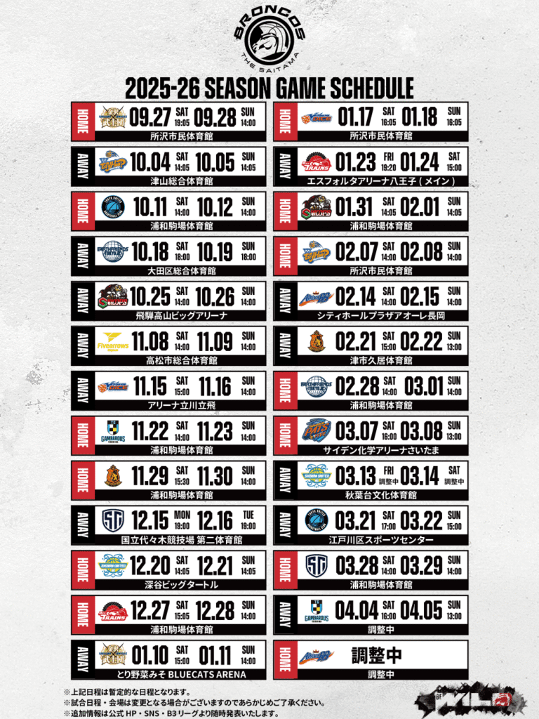 この度さいたまブロンコスでは試合開始時間に変更がございましたので下記の通りご報告させていただきます。