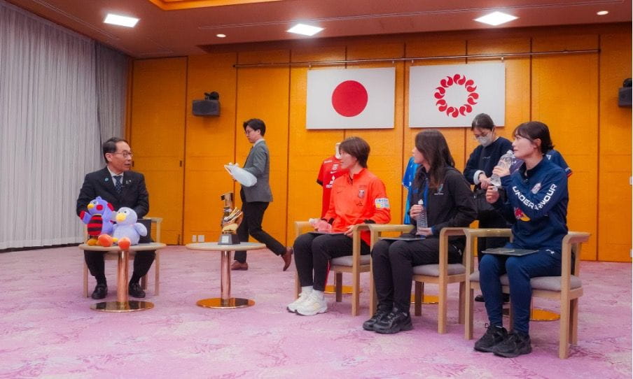 その後、知事公館に移動した3選手は、大野埼玉県知事と座談会を行い、女子サッカーを盛り上げるための意見交換や活動エリアの埼玉県の魅力などについて対話するとともに、WEリーグを盛り上げるための施策で、4年目を迎える知事杯への意気込みなども語っていました。