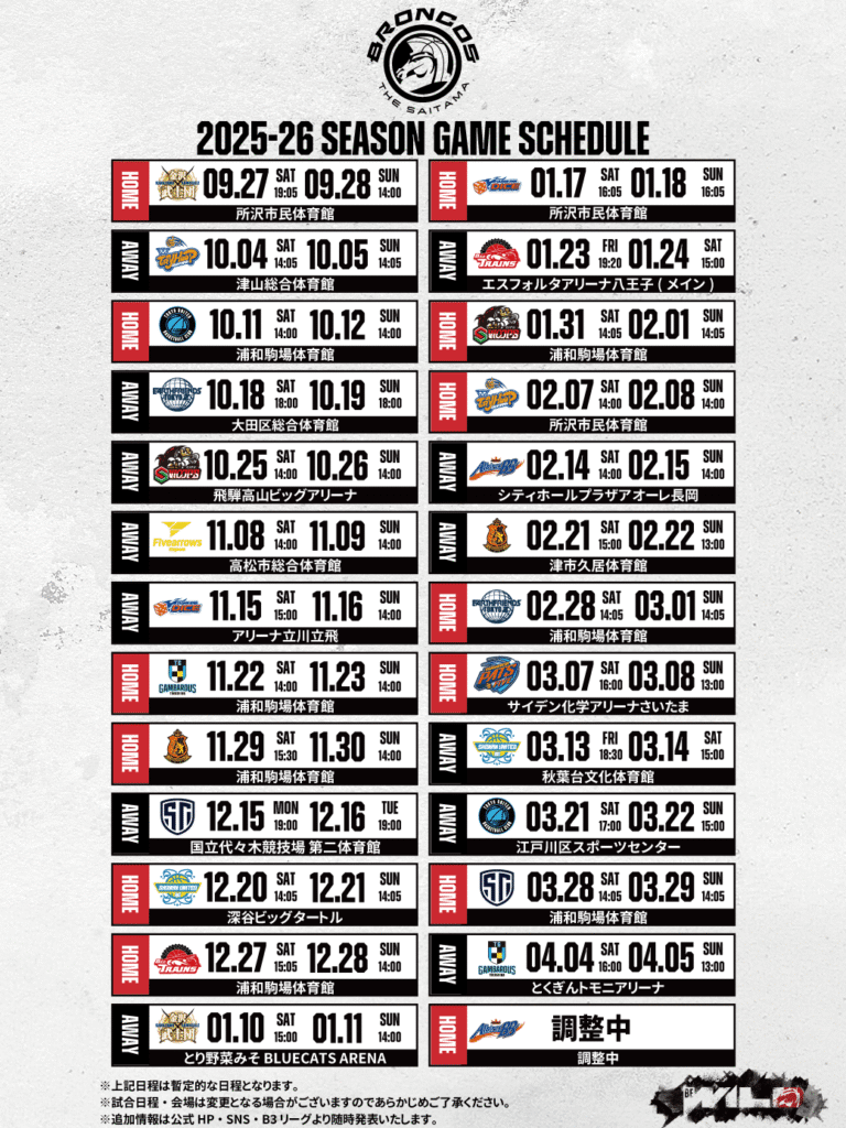 この度さいたまブロンコスでは試合開始時間に変更がございましたので下記の通りご報告させていただきます。