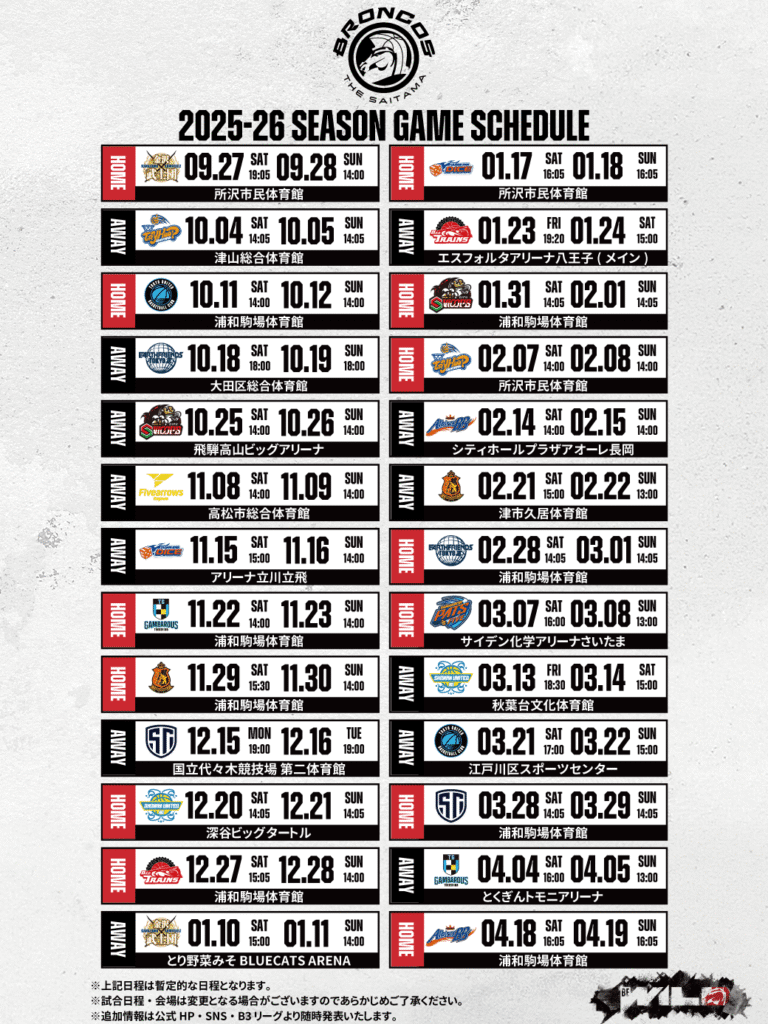 この度さいたまブロンコスでは未確定となっておりました試合時間・会場が確定いたしましたので下記の通りご報告させていただきます。
