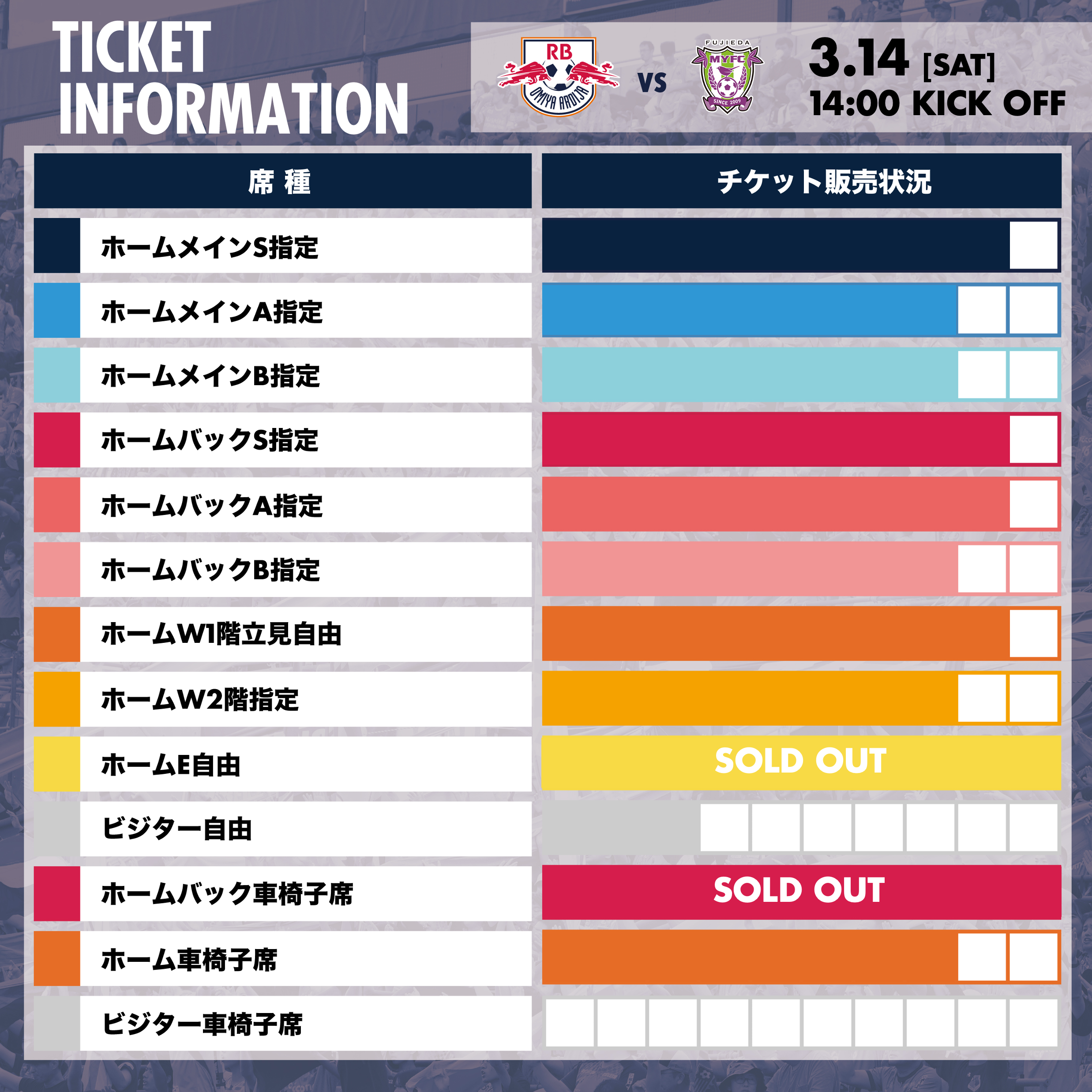 3/14・藤枝戦のチケット販売について、以下の席種の販売予定枚数が終了となりましたので、お知らせします。