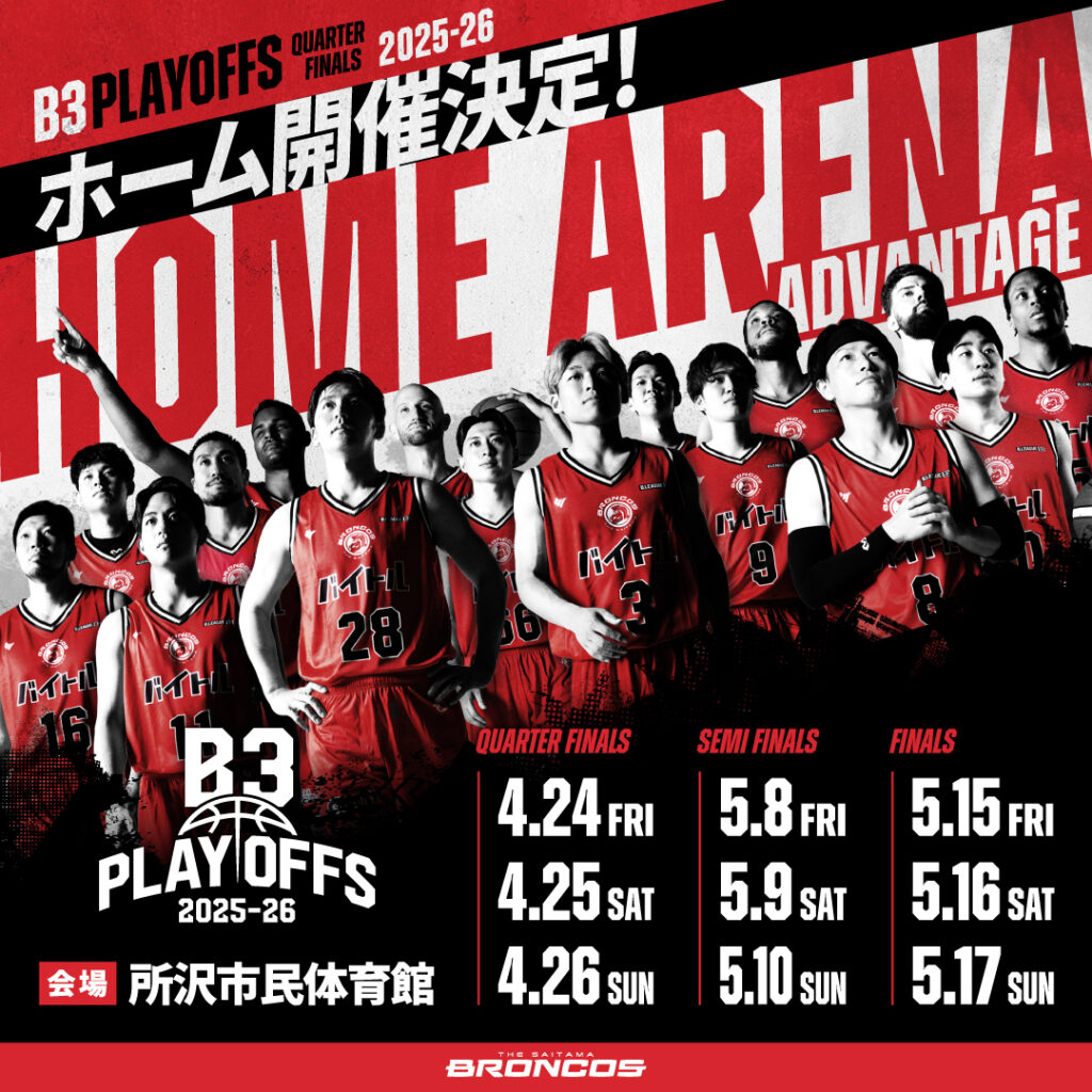 B3リーグ2025-26シーズン 第25節の2026年3月22日㈰までの試合結果を以って、さいたまブロンコスの4位以上が確定し、B3 PLAYOFFS QUARTERFINALS 2025-26 ホーム開催が決定いたしましたことをお知らせいたします。