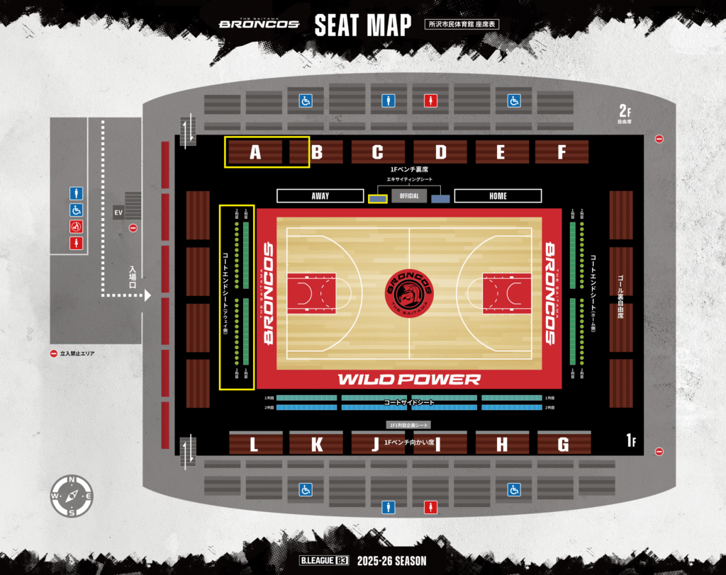 ・AWAYエリア:(1階ベンチ裏A・B一部、AWAYコートエンドシート、エキサイティングシート(AWAY側)の販売は、対戦相手決定後、翌営業日(土日祝除く)19:00より解放し販売いたします。