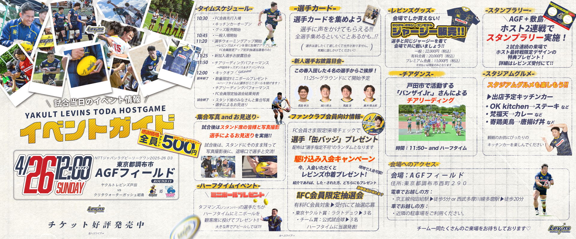 4月26日(日)は東京都・味の素スタジアム AGFフィールドにて開催されるクリタウォーターガッシュ昭島との第13節です!この試合に出場するメンバーおよびイベント情報をお知らせいたします。